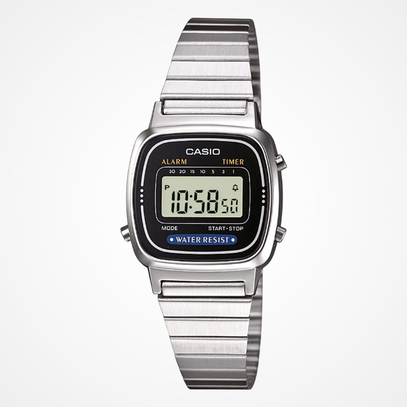Casio LA670WEA-1EF je kompaktna digitalna ura v klasičnem retro dizajnu s srebrnim kovinskim paščkom. Zaradi svoje majhne in lahke oblike je zelo udobna za vsakodnevno nošenje.